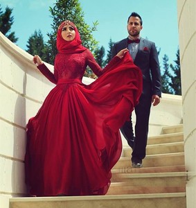 Red Islamic Long Sleeve Muslim Wedding Dress With Hijab Lace ...