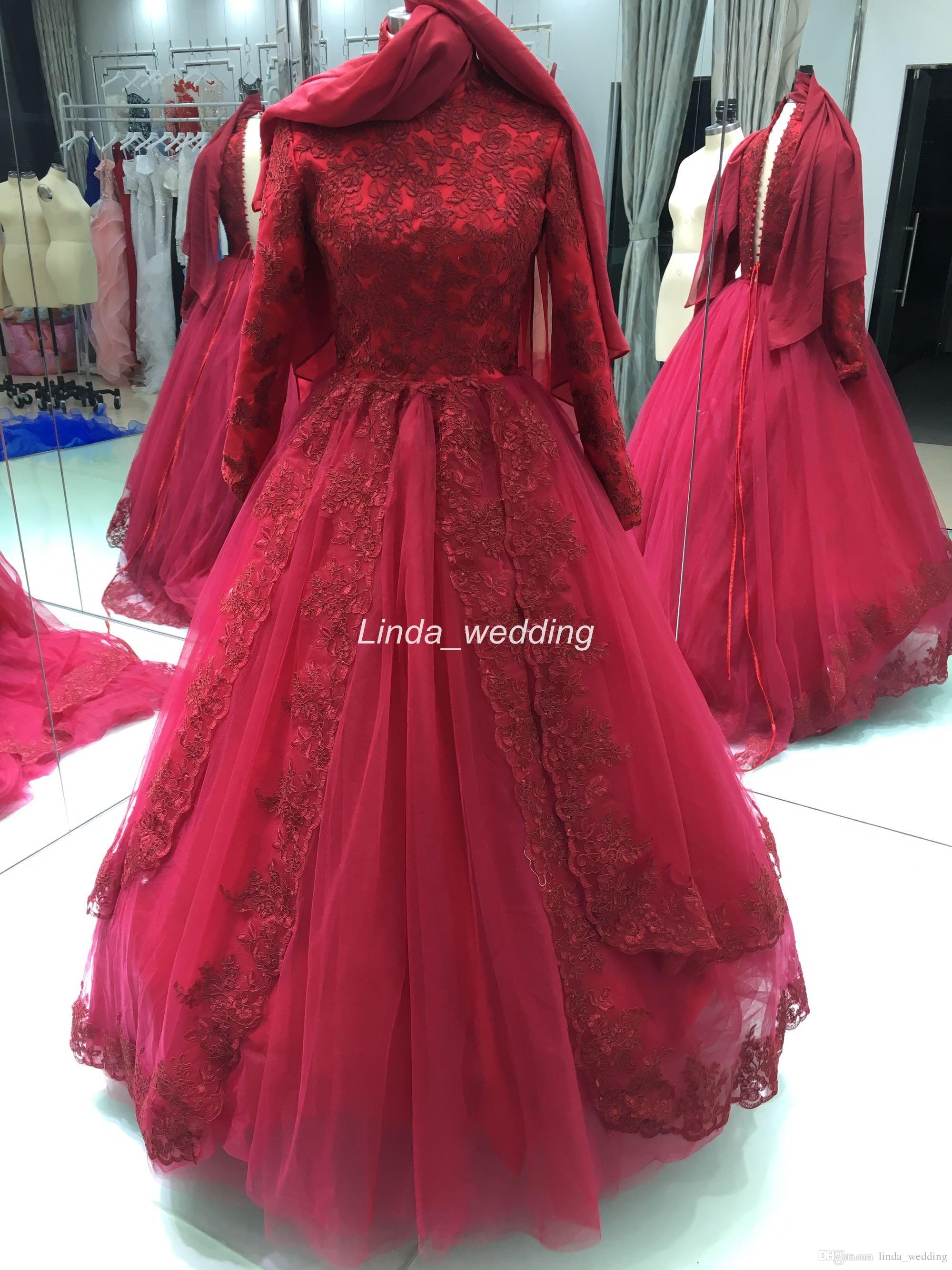 2017 Red Islamic Wedding Dress Ball Gown High Neck Long Sleeve ...